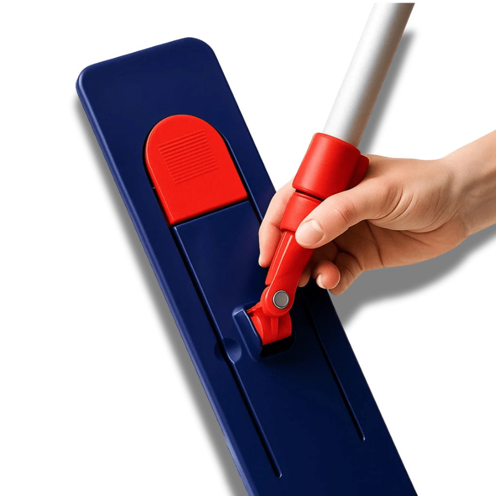 Die Kombination aus blauem Kunststoff und roten Funktionsteilen sorgt nicht nur für eine klare Farbcodierung im Reinigungsprozess, sondern auch für ein modernes und professionelles Erscheinungsbild. Der Mopphalter ist kompatibel mit allen gängigen Taschen- und Laschenmopps und lässt sich durch die leichtgängige Trittmechanik besonders hygienisch bedienen.